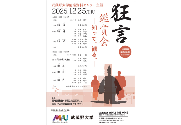 武蔵野大学能楽資料センター主催の狂言鑑賞会が12月25日(木)に開催される。 【A公演 12:30 ~14:15頃】解説 三浦裕子(能楽資料センター長)小舞「住吉」山本東次郎素囃子「神舞」松田弘之、田邊恭資、柿原孝則、澤… 続きを読む 武蔵野大学能楽資料センター主催 狂言鑑賞会─知って、観る。─